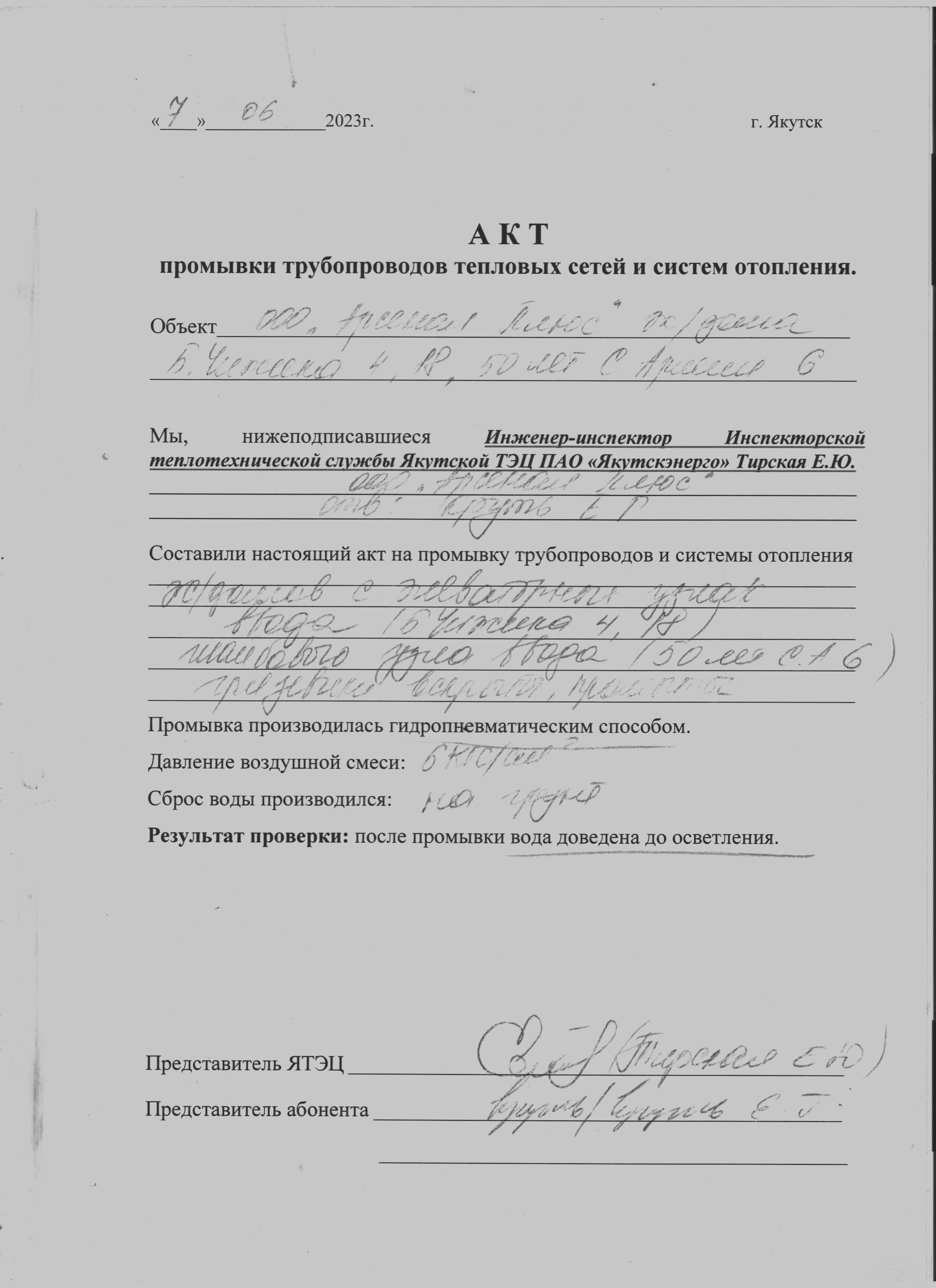 Акт промывки трубопроводных тепловых сетей и систем отопления.1: Чиряева 10, Богдана Чижика 2